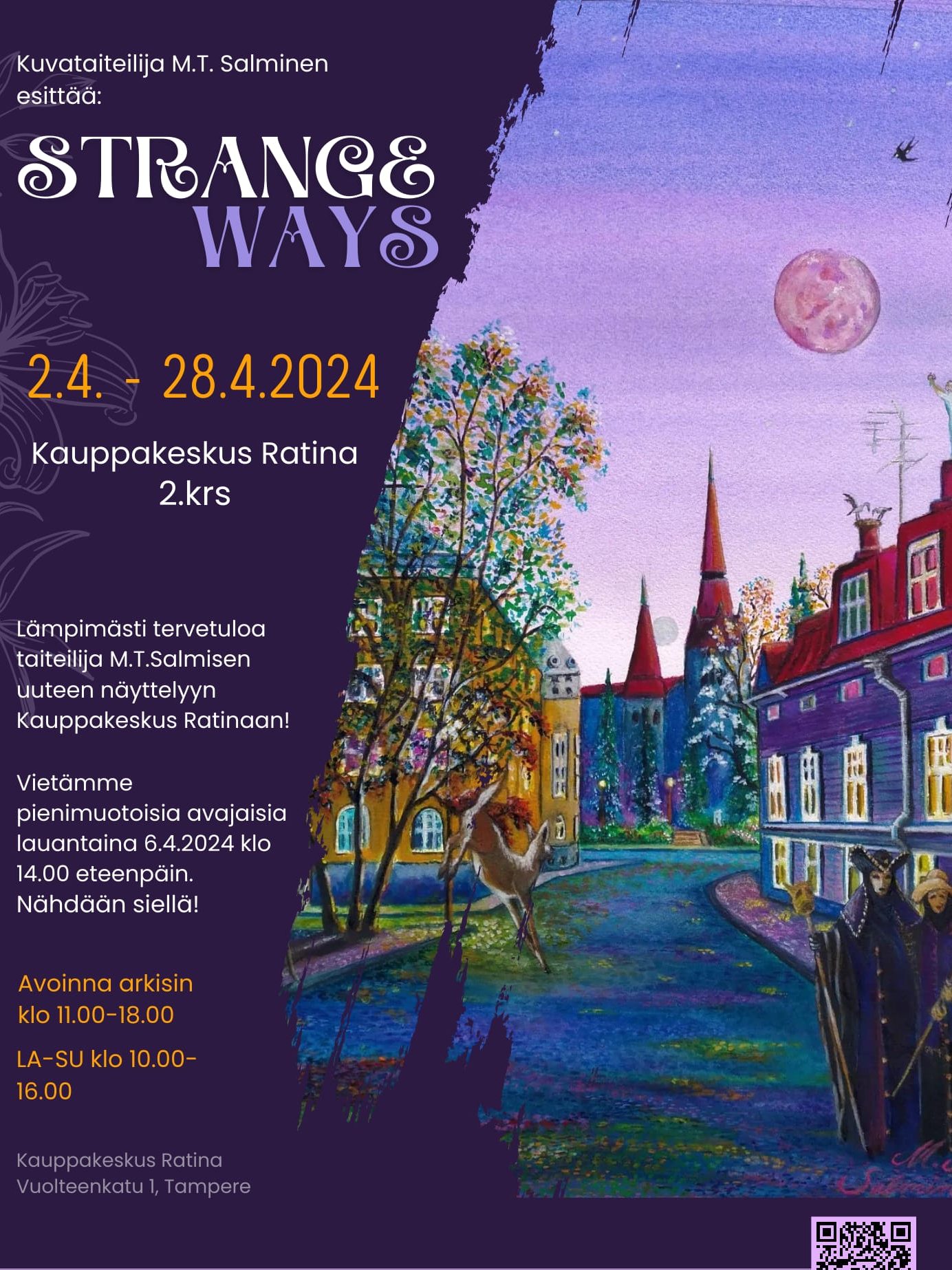 2.4.–28.4.2024 Yksityisnäyttely Ratinan kauppakeskus, Tampere.